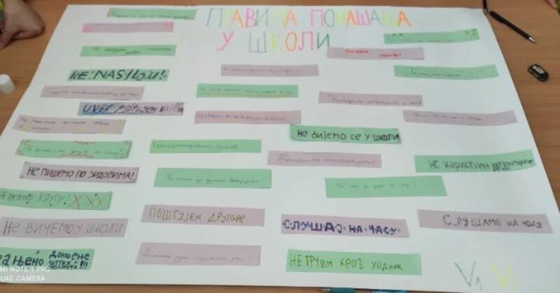 На часу Грађанског васпитања ученици V/1 и V/3 су заједно са психологом школе Јеленом Миленковић правили пано о правилима понашања у школи.