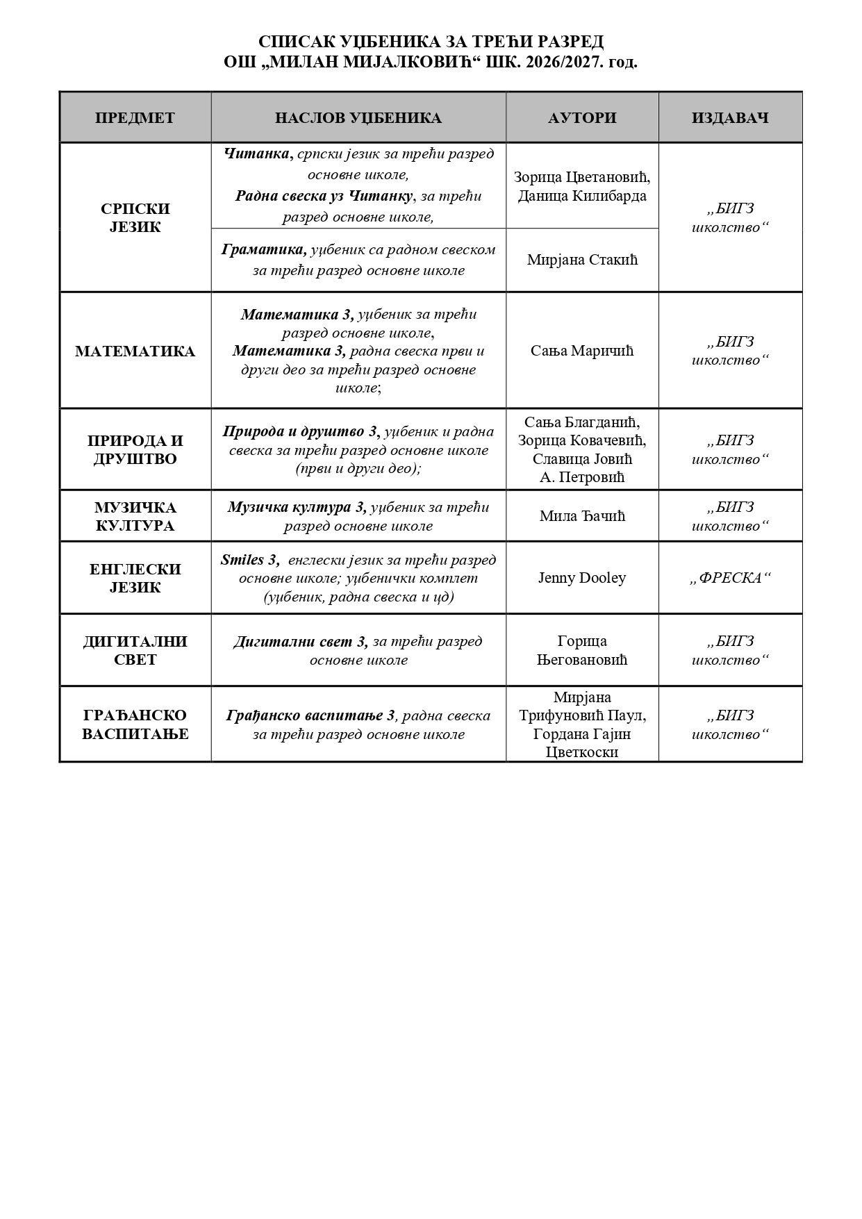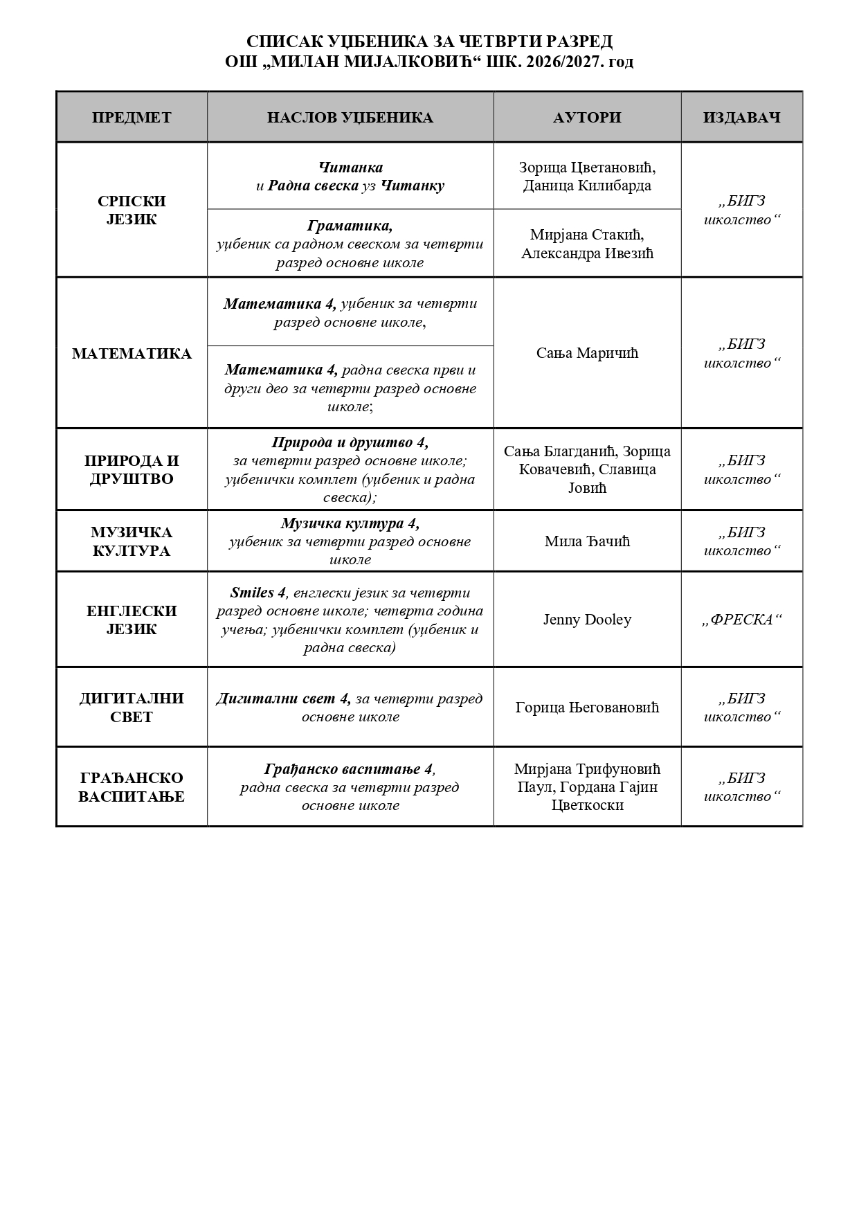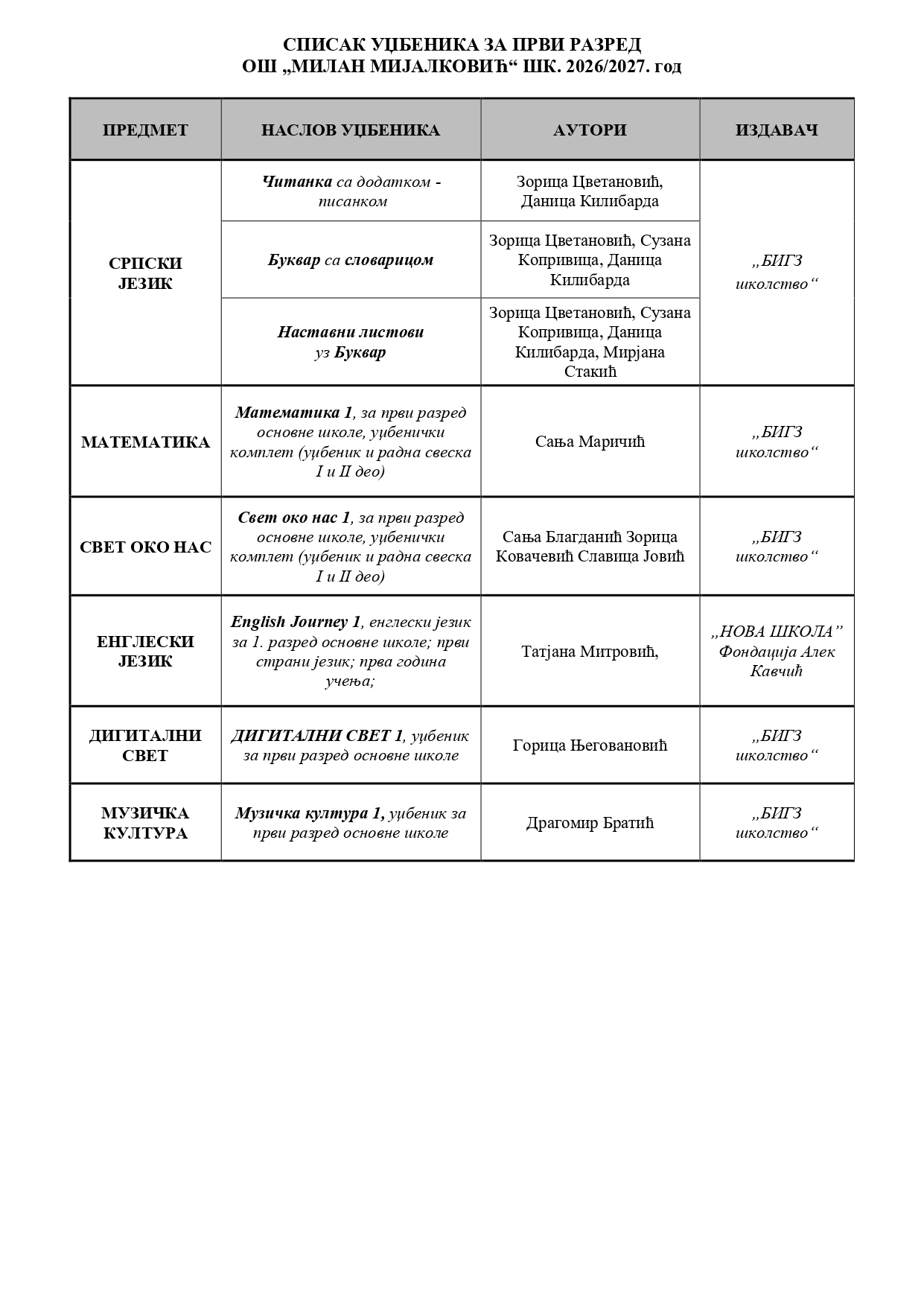 СПИСАК УЏБЕНИКА ЗА 2026/27 ГОДИНУ