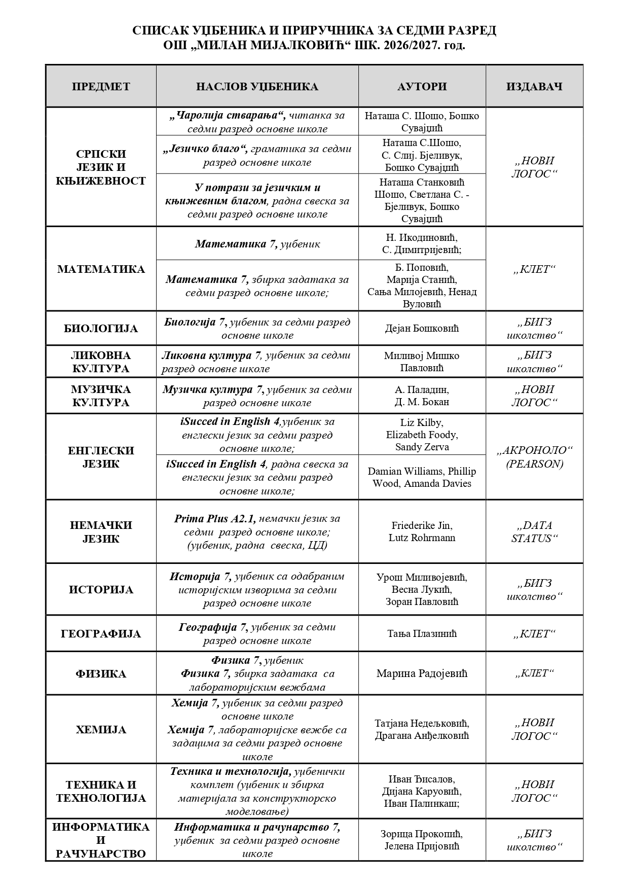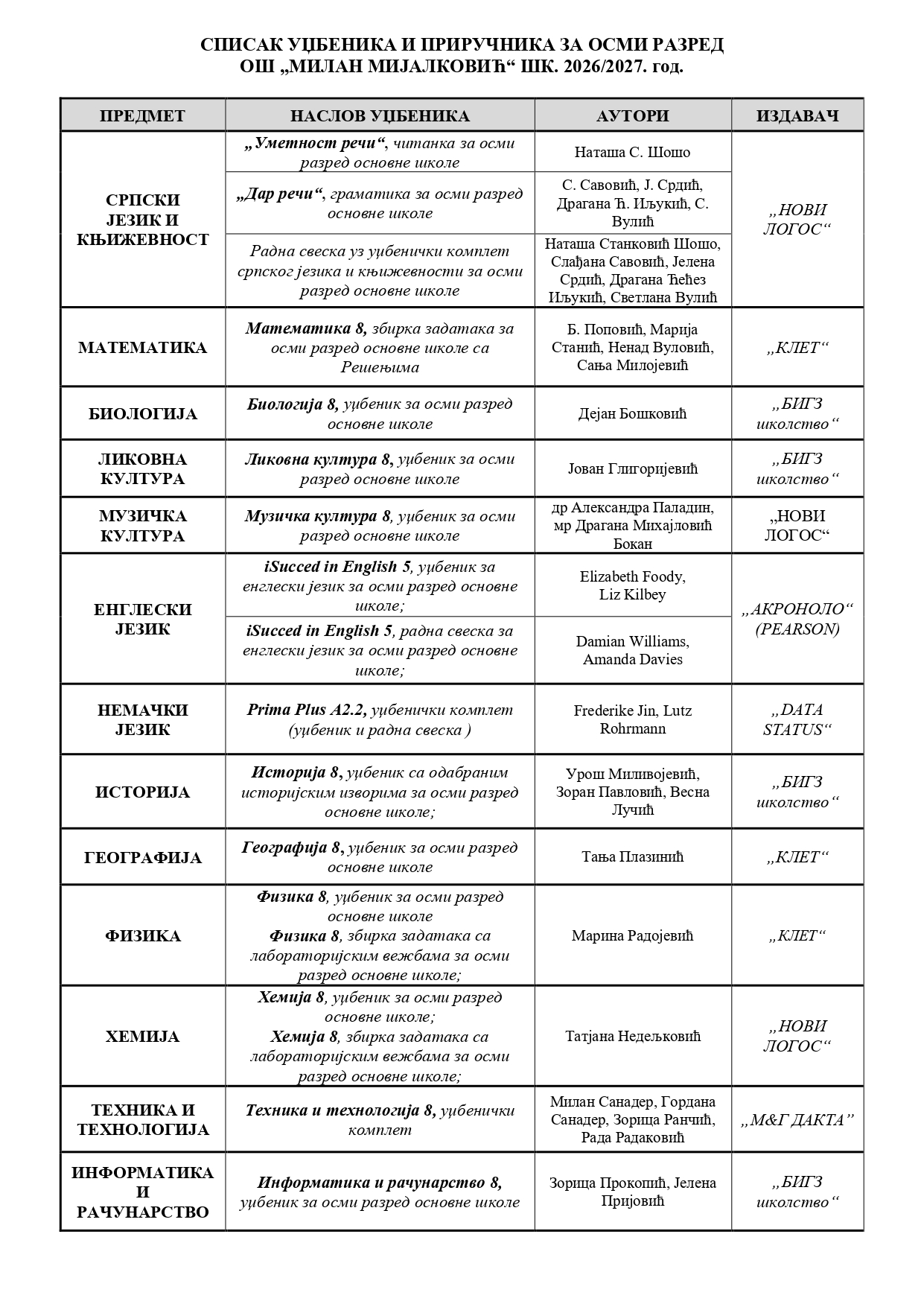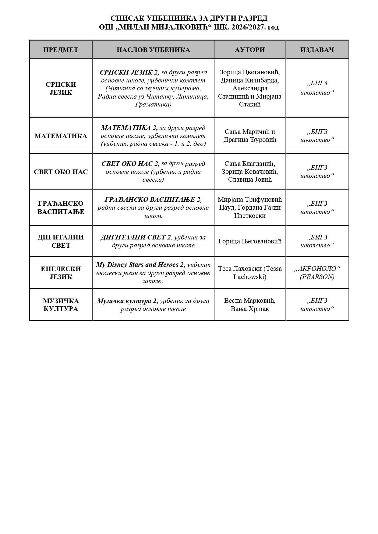 СПИСАК УЏБЕНИКА ЗА 2026/27 ГОДИНУ
